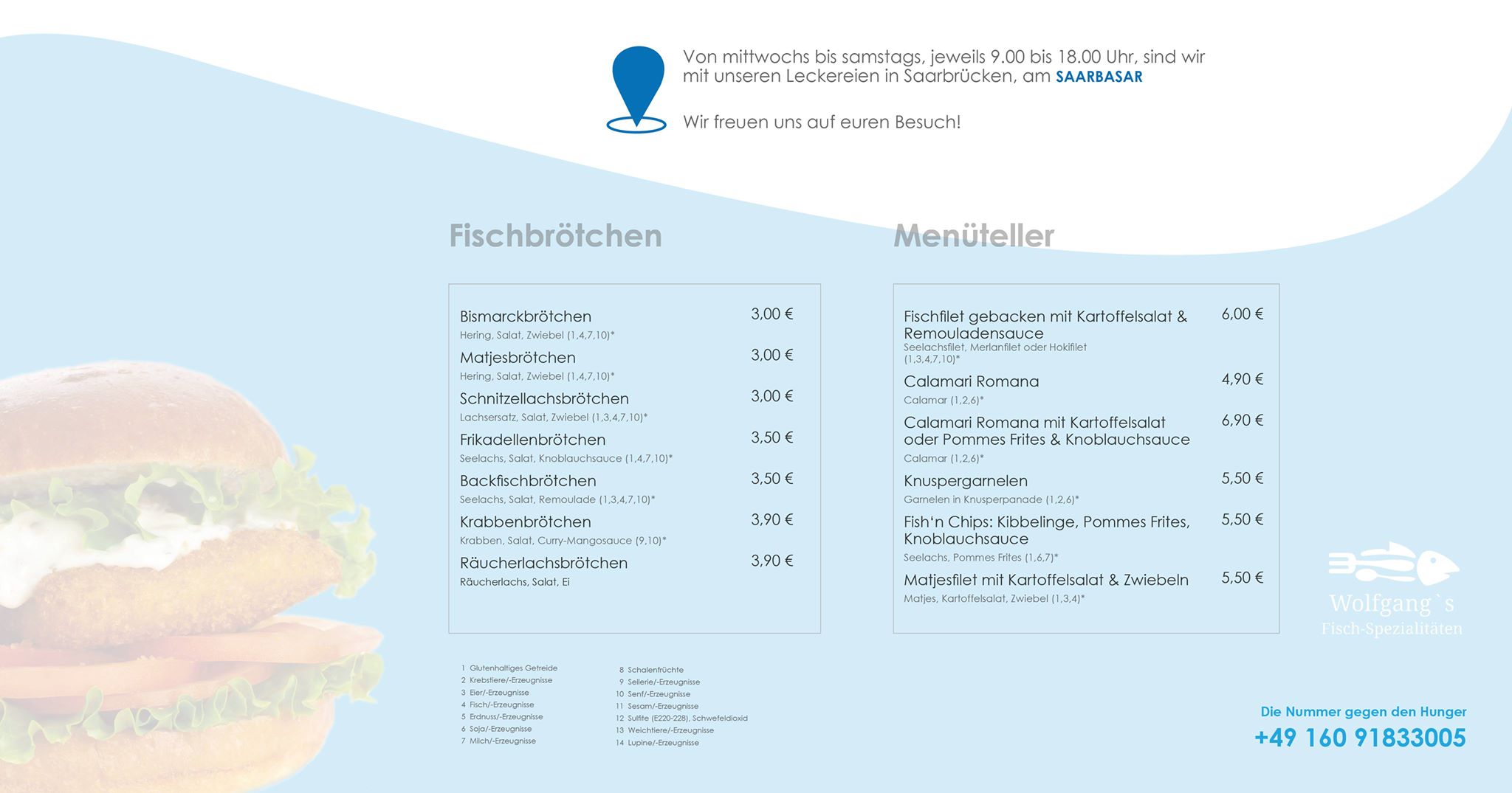 - Ein hervorragender Food-Truck mit umfassendem Getränkeangebot - Bei uns gibt es leckere Gerichte, wie beispielsweise verschieden belegte Fischbrötchen bis hin  zu einem kompletten Tellergericht und dazu ein kaltes Erfrischungsgetränk – wir beraten Sie gerne. Nutzen Sie auch das kostenlose WLAN vom Saarbasar, womit Sie während Ihres Aufenthalts gemütlich im Internet surfen können.